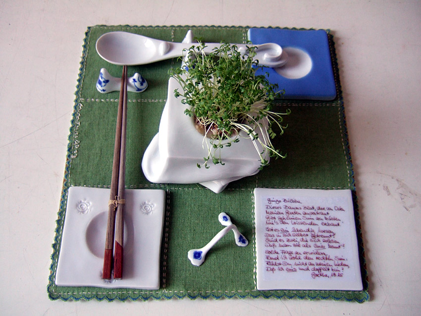 »Spielraum 121«, Porzellan, Glas, Holz, Kresse, Leinen, 2013, Porzellanium Triptis