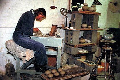Weißes, rotes, braunes, lederfarbenes, graues und schwarzes Steinzeug im Elektroofen niedrig- und hochgebrannt. Elegantes Tee- und Kaffeegeschirr und verformte Vasen aus rotem Ton nachtblauglänzend glasiert, Reliefwandplatten, Terrakotta-Gartengefäße und Skulpturen entstehen.